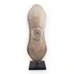 The beaded Cameroon shields bring Afrochic elegance into any space, admired by decorators and collectors of African décor. Each shield is handcrafted by artisans, inspired by the protective emblems once carried by Tikar Tribe hunters and warriors. Symbolising wealth and status, they feature intricate adornments of beads, cowrie shells, and Manila string. These one-of-a-kind pieces make striking wall or floor displays.