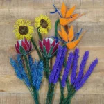 The Strelitzia (Bird of Paradise) adds a tropical flair with its iconic form in orange or yellow hues. As sizes vary slightly, every piece is unique, capturing the essence of natural elegance.