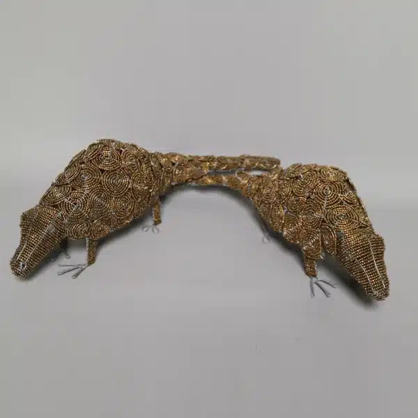 This beaded pangolin is handcrafted from metal wire and glass beads, echoing the animal’s textured scales and curled pose. Each piece is handmade, so yours will have its own character and small variations.