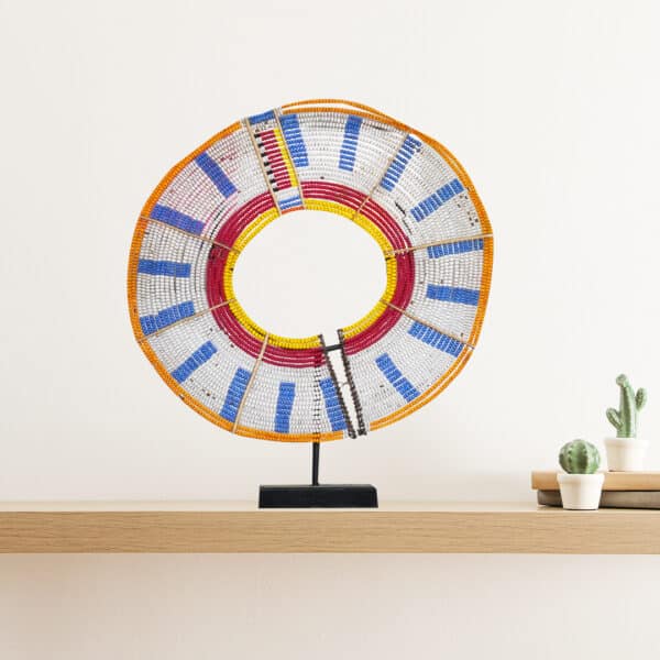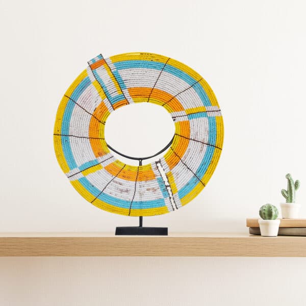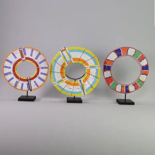These traditional Maasai beaded collars, from Kenya and Tanzania, were historically worn by married women as symbols of wealth and status. Each piece carries cultural meaning, with colours and patterns reflecting clan affiliations and personal identity. Crafted with intricate beadwork, the collars are mounted on custom stands. No two are identical, making each a one-of-a-kind statement piece that captures the rhythm and heritage of Maasai culture.