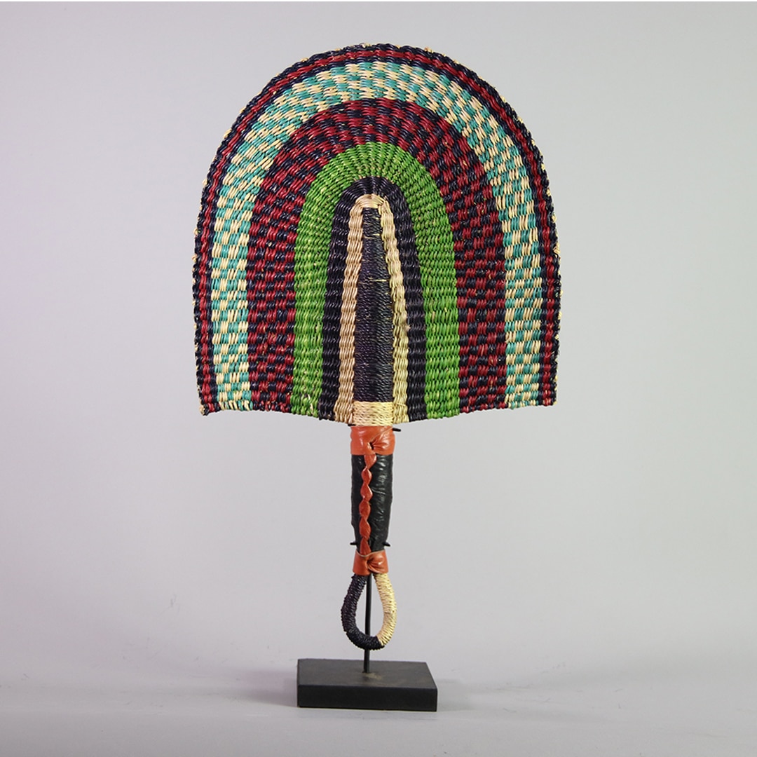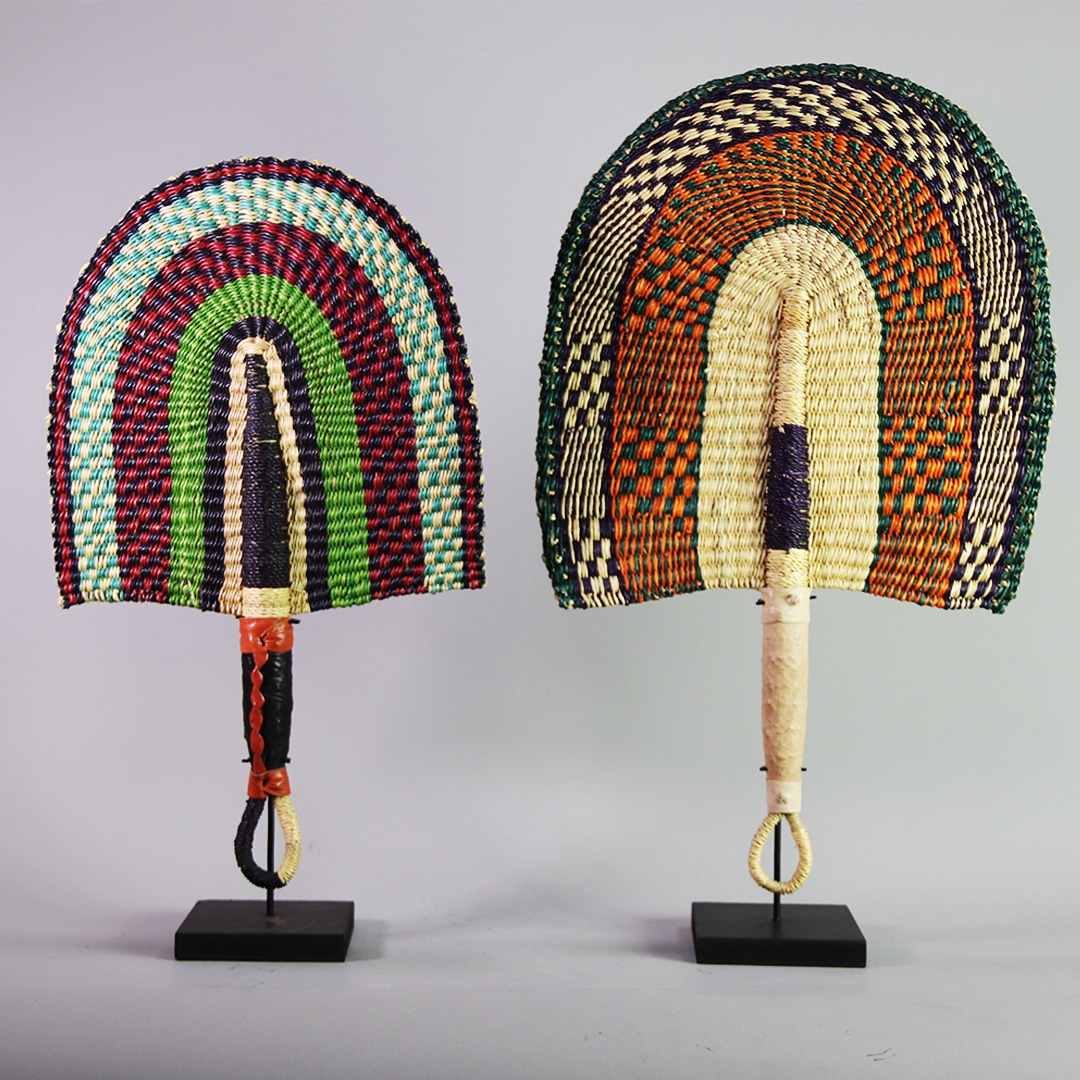 Handwoven in Ghana from natural elephant grass, these vibrant Bolga fans showcase authentic African craftsmanship. Dyed in bold, eye-catching colors, the intricate weaving ensures a sturdy yet flexible design. Perfect for wall displays, they can be styled as a set of three or paired with other baskets for a striking decorative accent.