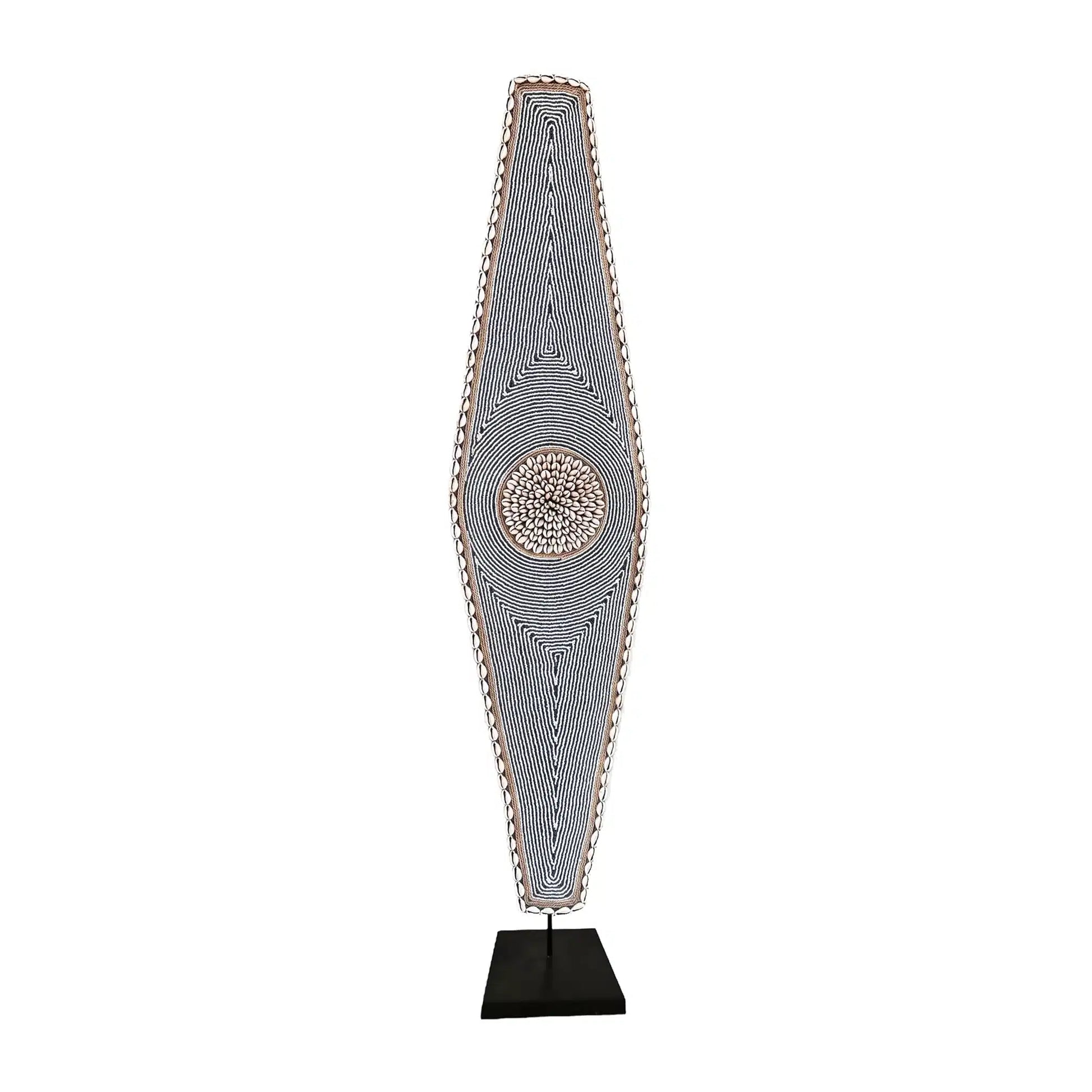 Tall and narrow form with a strong vertical presence. Symmetrical pattern built from tightly set shells. Circular shell rosette at the center. Fine linear detailing runs the full length.